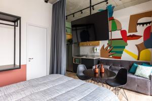 Inside the apartment, guests will find two beds alongside air conditioning and heating for comfort throughout their stay. The studio includes a well-equipped kitchen with kitchenware, refrigerator, microwave and stovetop to prepare meals easily. Additional room amenities include a work desk and bed linen while the bathroom provides a hairdryer as well as complimentary toiletries including shampoo.
