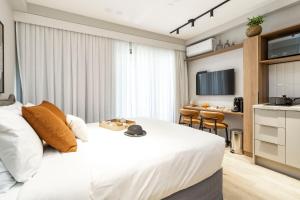 Each studio apartment includes one bed, a fully equipped kitchen with a stovetop, refrigerator, microwave, coffee machine, and kitchenware to prepare meals at leisure. Guests will find air conditioning throughout the unit as well as a private bathroom fitted with a shower, bidet, hairdryer, body soap, shampoo and conditioner. Linens such as towels and bed linen are provided in every room.
