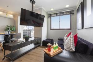 This one-bedroom apartment features two beds along with a living room equipped with a television and seating area. The fully equipped kitchen includes kitchenware and a microwave to support all your cooking needs, complemented by air conditioning and a work desk for added comfort.