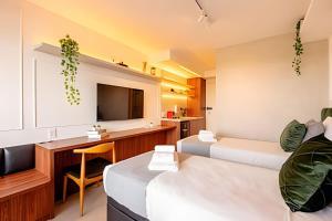 В студии имеются две кровати и необходимые удобства: постельное белье, кондиционер и утюг. Кухонная зона полностью оборудована плитой, микроволновой печью, кофемашиной, посудой и сушильной машиной для удобства приготовления пищи и стирки. Также предоставлена стиральная машина для дополнительного комфорта.