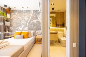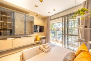 Il monolocale include un letto e presenta un angolo cottura completamente attrezzato con forno, microonde, piano cottura, frigorifero, macchina per il caffè e utensili da cucina. Gli ospiti possono godere del comfort dell’aria condizionata regolabile individualmente oltre alla lavatrice e al bagno privato completo di set di cortesia omaggio e asciugacapelli.