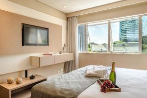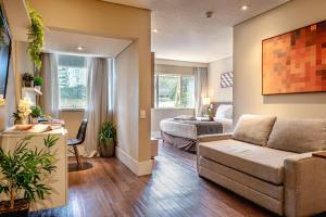 Estúdio Aconchegante com AC, Vaga offers free WiFi throughout the property alongside television access in the living area. The building features a bar and restaurant on-site as well as outdoor furniture for relaxation. Additional services include a fitness centre, laundry facilities, smoke detectors in-room safety equipment such as fire extinguishers available inside the apartment plus express check-in/check-out options handled by the 24-hour front desk.