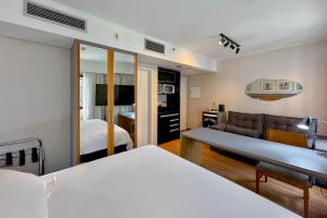 Accommodation comprises an air-conditioned unit with two beds, a flat-screen TV, sofa bed, work desk, hardwood flooring, wardrobe, ironing facilities including iron and ironing service. The fully equipped kitchen features a refrigerator, microwave, kitchenette area with kitchenware, minibar and coffee machine. A washing machine is also provided for guest convenience while the bathroom includes body soap supplies along with either bathtub or shower options plus hairdryer.