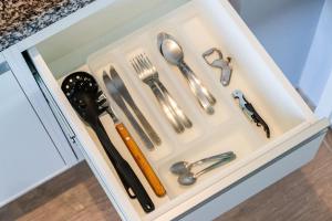 Das Apartment verfügt über ein Schlafzimmer mit zwei Betten sowie eine voll ausgestattete Küche mit Kochgeschirr, Herdplatte, Kühlschrank, Geschirrspüler, Mikrowelle und Grill. Weitere Küchenannehmlichkeiten sowie ein Wäschetrockner sind ebenfalls vorhanden. Das private Badezimmer ist mit kostenfreien Pflegeprodukten ausgestattet. Zusätzliche Ausstattungsmerkmale umfassen Heizung, Bettwäsche und einen Arbeitstisch.