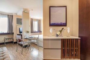 Lo studio climatizzato comprende due letti e un angolo cottura completamente attrezzato con stoviglie, microonde, tostapane, bollitore elettrico, macchina per il caffè e set per la preparazione di tè e caffè. Gli ospiti possono usufruire inoltre di un’area pranzo con tavolo da pranzo, divano letto, scrivania e armadio. Il bagno privato è dotato di doccia e articoli da toilette in omaggio quali shampoo e balsamo. Tra gli altri comfort della camera figurano insonorizzazione, aria condizionata regolabile individualmente nella stanza, TV a schermo piatto con canali via cavo, cassaforte personale, ferro da stiro con asse da stiro e cuscini anallergici.