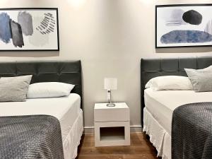 Accommodation comprises two bedrooms with four beds in total, along with two bathrooms fitted with walk-in showers and complimentary toiletries. The unit features a flat-screen TV with streaming services, individual air conditioning controls for each room, a seating area including a sofa bed and sofa, as well as ironing facilities and a wardrobe closet. Guests will also find amenities such as towels, bed linen, an iron with ironing board, clothes drying rack, safe deposit box, heating system, hardwood and tile flooring throughout the space.
