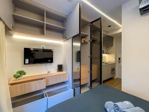 Each studio features air conditioning, a balcony or terrace with outdoor dining area overlooking the city, and a private bathroom equipped with a hairdryer and complimentary toiletries. Guests can prepare meals in well-fitted kitchens that include stovetops, refrigerators, microwaves, kitchenware, coffee machines and dining tables. Additional room amenities comprise flat-screen satellite TVs, wardrobes or closets, seating areas, work desks as well as irons.