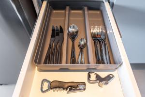 Das Apartment verfügt über ein Schlafzimmer mit einem Bett und eine voll ausgestattete Küche mit Herdplatte, Kühlschrank, Mikrowelle, Kaffeemaschine sowie Tee- und Kaffeezubereitungsmöglichkeiten. Im Küchenbereich finden Gäste zudem einen Esstisch und sämtliches notwendiges Kochgeschirr vor. Das Badezimmer ist mit Dusche, eigenem WC, Haartrockner und Duschgel ausgestattet. Zusätzliche Annehmlichkeiten im Zimmer umfassen Bügeleisen, Kleiderschrank bzw. Stauraum sowie synthetische Kissen ohne Federn.
