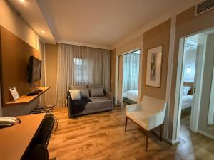 Accommodation includes a suite with two beds, air conditioning, soundproof walls, and a private bathroom equipped with a shower, hairdryer, complimentary toiletries including shampoo and conditioner. The suite features a full kitchen complete with stovetop, microwave, kitchenware, minibar, coffee machine as well as tea and coffee making facilities. Guests will find seating areas with sofas and wardrobes alongside work desks in the room.