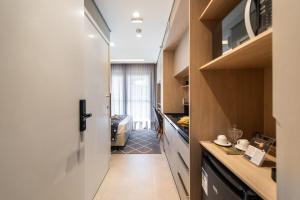 Le cucine completamente attrezzate includono utensili insieme ad elettrodomestici come piano cottura, frigorifero, forno microonde tostapane e asciugatrice per la cura dei vestiti. L’edificio offre unità al pian terreno oltre ai piani superiori accessibili tramite ascensore, in ogni unità sono installati dispositivi di sicurezza quali estintori e rilevatori di fumo.