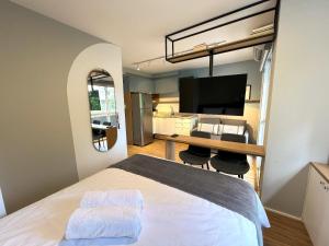 This air-conditioned apartment features a fully equipped kitchen with a refrigerator, microwave, electric kettle, and kitchenware to prepare meals at your convenience. The living area includes seating with a sofa bed, TV, work desk, wardrobe/closet, clothes drying rack, iron and heating.