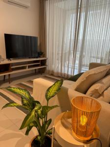 This air-conditioned apartment includes one bedroom with two beds and a separate living room featuring a sofa bed. The fully equipped kitchen comes with an oven, stovetop, refrigerator, microwave as well as coffee machine and tea making facilities for added comfort. The bathroom offers a shower along with body soap and hairdryer while linens such as towels and bed linen are provided.