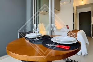 Inside the studio, guests will find one bed along with individually controlled air conditioning and a dressing room to change comfortably. The fully equipped kitchen features a stovetop, microwave, toaster, kitchenware and washing machine to accommodate various needs. Additional in-room amenities include an iron, wardrobe or closet, bed linen as well as bathroom essentials like conditioner, shampoo and hairdryer.